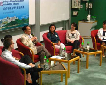 8日在科大就施政報告舉行咨詢會,有近300名學生進場。曾蔭權表示,希望聽取不同階層的意見,切實地回應市民最關心的香港的事項。會上不少學生踴躍發(fā)言,主要關心民生的議題。