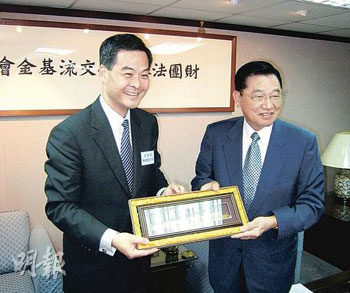 梁振英以香港專業(yè)聯(lián)盟主席身分,率領港交所、貿(mào)發(fā)局、國際仲裁中心等18名經(jīng)貿(mào)專業(yè)人士組團訪臺,23日拜會“陸委會”、海基會、工業(yè)總會、商業(yè)總會,由海基會董事長江丙坤、“陸委會”副主委劉德勛接見。