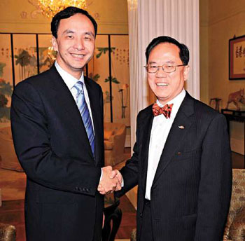 中新網4月2日電 據香港《大公報》報道,香港特區行政長官曾蔭權1日在禮賓府會見臺灣桃園縣縣長、國民黨副主席朱立倫。他們就兩地的最新發展交換意見,雙方都認為兩地應加強各方面的交流。