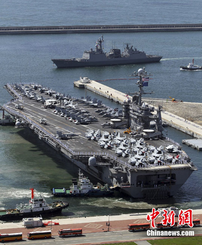 中新網7月21日電 據韓聯社報道,美國海軍第7艦隊的航空母艦“喬治·華盛頓”號21日抵達釜山港,準備參加從25日開始的韓美聯合軍演。