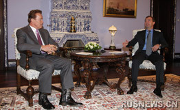 中新網10月11日電 據俄新網報道,11日,俄羅斯總統德米特里·梅德韋杰夫在戈爾基總統官邸接見美國加里福尼亞州州長阿諾·施瓦辛格。