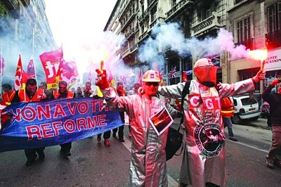 由于法國總統薩科齊執意進行養老金改革,即準備將最低退休年齡由60歲延長至62歲,領取全額政府退休金的年齡則從65歲提高至67歲。這讓法國工會組織十分不滿。為了逼迫政府讓步,連日來,他們發動了數次罷工和示威游行。截至當地時間16日,罷工潮已席卷法國大多數地區。