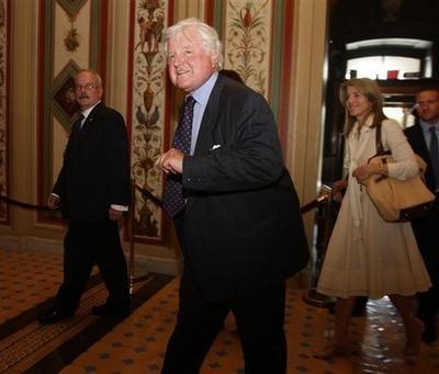 他在表決前,與夫人維多利亞一起步入國會山莊,然后由民主黨準(zhǔn)總統(tǒng)候選人奧巴馬參議員、馬薩諸塞州參議員克里,以及他的兒子、羅得島州眾議員帕特里克•肯尼迪陪同來到參院大廳。