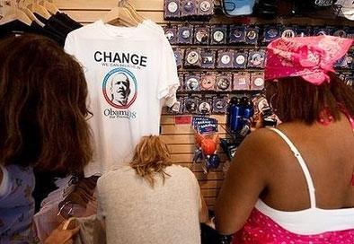 在奧巴馬陣營經營的官方商店中,帶有“希望”標語字樣的T恤衫正在熱賣,“希望”圖案還被雕刻成雕像,擺在民主黨大會召開地百事中心的大門邊。一名紀念品商店老板說:“大會召開這幾天,生意特別紅火,顧客蜂擁而來,商品銷量翻了一番。”