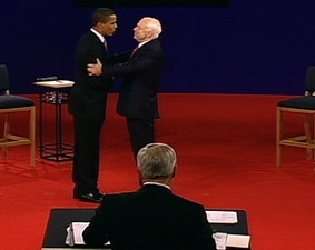 奧巴馬與麥凱恩均表示有信心贏得這場辯論,并握手示意。經濟問題將再次成為此次辯論的焦點。