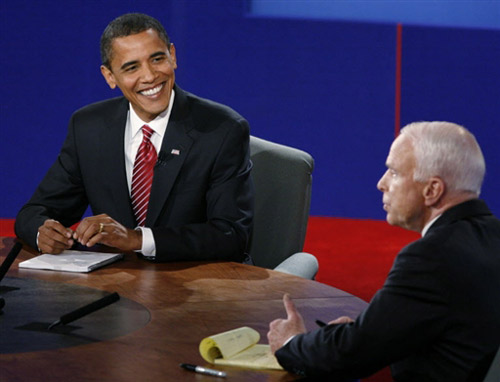 美國共和黨總統候選人麥凱恩和民主黨總統候選人奧巴馬在總統選舉投票前的最后一場電視辯論。(資料圖)