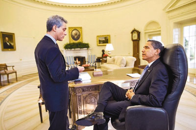 奧巴馬第一天上班,與白宮幕僚長伊曼紐爾談話。