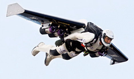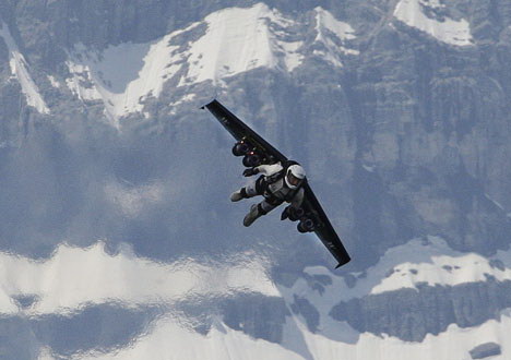 前瑞士戰斗機飛行員羅西花了五年的時間來建造和完善動力翼套裝,他昨天穿著這套動力翼套裝跳離了一架小型飛機。當他從2250米的飛機上跳下時,他展開了長達3米的動力翼,動力翼被綁在他的身后。當從自由落體狀態轉為滑行狀態后,他啟動了四個發動機,這使他的飛行速度加速至每小時304公里。他在爬升至780米后再次向地面俯沖,在身后留下一串特效煙霧。