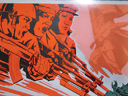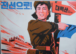 二00七年夏天,朝鮮當(dāng)代畫(huà)家作品和國(guó)家畫(huà)室制作的宣傳海報(bào)在倫敦La Galleria首展時(shí),現(xiàn)場(chǎng)掛滿了朝鮮紅色的旗幟,英倫天空從來(lái)沒(méi)有那么朝鮮。