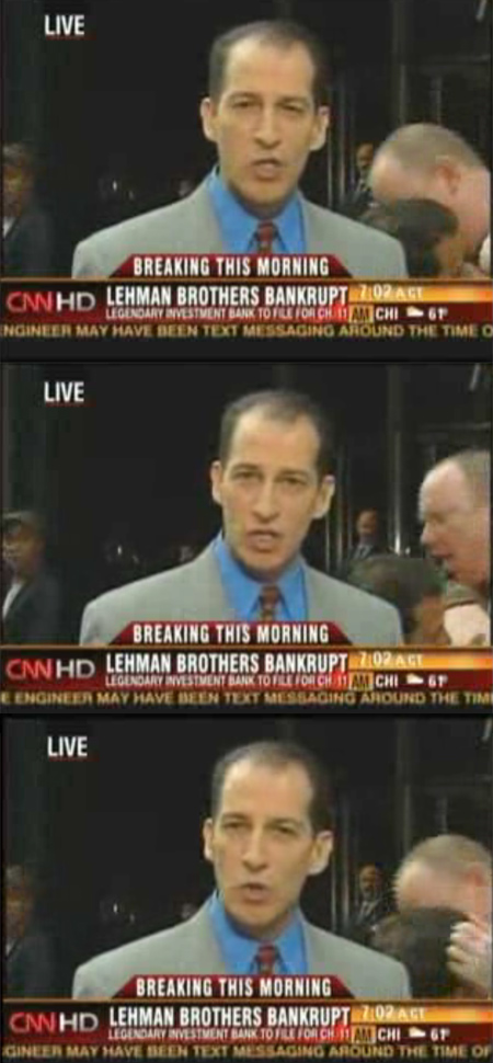 據(jù)韓國《朝鮮日報》報道,14日凌晨(當(dāng)?shù)?美國有線電視頻道CNN以緊急新聞的形式報道了雷曼兄弟公司向法院申請破產(chǎn)保護(hù)的消息。該新聞是以在直播間與趕赴紐約時代廣場雷曼公司總部的CNN現(xiàn)場記者直播連線的方式播出的。