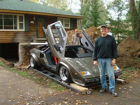 據俄羅斯新聞網報道,這名美國人在自家地下室,用時17年手工打造出自己的超級蘭博基尼跑車。但如何從地下室脫出跑車又成一問題,為此Imhoff不惜墻倒屋塌,專門找來掘土機在自己房屋下開出一個大洞,成功將跑車拉出來。在這個過程中,他唯一擔心的是砸下了的石頭會否砸壞他的愛車。