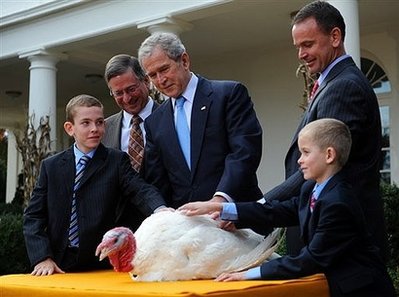 即將卸任的布什正經歷他任期中最后的一些時刻:最后一次參加Tee Ball比賽,最后一次參加超級碗勝利慶典,“最后一次與火雞同臺”。