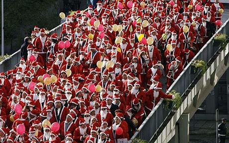 12月14日,葡萄牙城市波爾圖出現(xiàn)了一支由14000名圣誕老人組成的游行隊伍,他們都是由當(dāng)?shù)厥忻裱b扮而成的,其中不乏婦女和兒童。所有人都身著紅白色的衣服,帶著紅白色的帽子,像模像樣地在下巴上沾了白色胡子,組成了紅色的海洋,進行慈善宣傳。這次圣誕老人游行人數(shù)打破了世界紀(jì)錄。