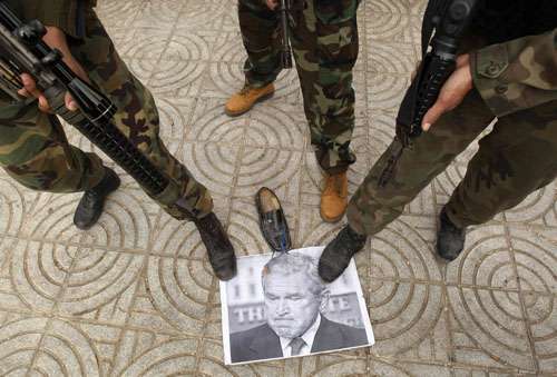 周日在布什同馬利基聯(lián)合舉行的新聞發(fā)布會上,扎伊迪脫下自己的鞋子,怒向布什砸去,同時用阿拉伯語大喊,“這是臨別之吻,你這禽獸。這是孤兒寡婦以及在伊拉克喪生的人送給你的!”扎伊迪隨后被安全人員按倒在地,帶離了會場。