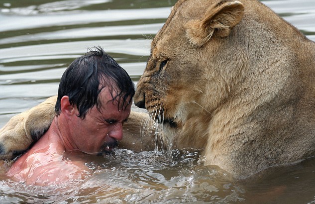 和他一起游泳的獅子Meg ,體重185公斤,是個愛好游泳的獅子。