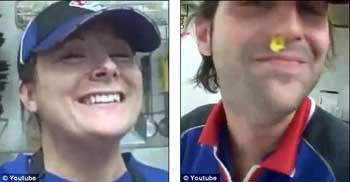 報道稱,這兩名員工用攝像機(jī)進(jìn)行了自拍,并將錄像放到了網(wǎng)上,引起軒然大波。錄像中,一名男員工正在做三明治,他把一小塊奶酪抹在自己的鼻孔,然后又得意忘形的把這塊奶酪放進(jìn)了三明治中。隨后,他還將一段臘腸放在自己的屁股后,疑似在上面放屁。