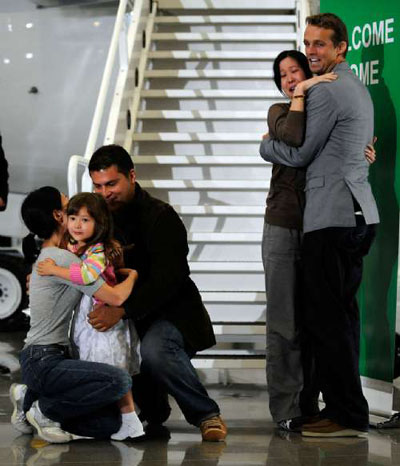 李承恩與丈夫邁克爾-薩爾達杰和四歲女兒漢納擁抱時,流下喜悅的眼淚。凌志美與丈夫伊恩-克萊頓擁抱,其它家人則擠在他們周圍,激動得流淚。