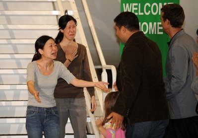 三十二歲的凌志美、三十六歲的李承恩(前譯李尤娜)與克林頓所乘坐的飛機在洛杉磯附近的伯班克機場降落,兩名女記者下機時,激動得泣不成聲。