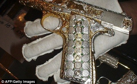報道說,有3支沖鋒槍幾乎整個槍身都包覆黃金,并有一枝黃金制作的滅音器。一名顯然特別注重形象的幫派份子,他的手槍更是獨一無二,槍上鑲嵌了整排華麗的紅綠寶石和一個法拉利(Ferrari)徽記。