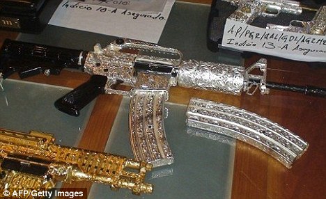 據報道,這些槍支顯示了幫派奢華份子如何花用他們不法的財富。照片顯示軍方在墨西哥西部一次突擊行動中,起出31支槍,大部分外表都包覆著黃金或白銀外皮,或鑲嵌著許多閃閃發(fā)光的鉆石。