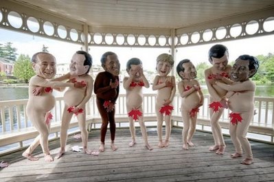 來自加拿大樂施會組織的幾名成員裝扮成八國首腦,他們帶上奧巴馬、默克爾等領導人的面具,身穿肉色緊身衣,看上去仿佛“赤身裸體”,而關鍵部位則用一片加拿大特有的紅葉遮羞。他們在鏡頭前搔首弄姿、大擺pose,欲以此嘲諷G8峰會。