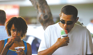 果然,美國總統(tǒng)這次又選擇了這種混合檸檬、櫻桃以及熱帶水果糖漿的刨冰,沒有再加紅豆和奶油等點(diǎn)綴。“我喜歡直接吃這種冰,不需要其他裝飾,”奧巴馬指著菜單上的“雪巴馬”字樣笑著告訴記者。