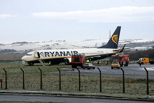 一架從都柏林起飛的波音七三七客機(jī),在蘇格蘭西部的貝勒斯特威怡機(jī)場(chǎng)降落時(shí),因?yàn)槁访娼Y(jié)冰而滑出跑道,飛機(jī)最后停在跑道西側(cè)的草坪邊緣。