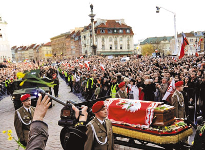 當(dāng)靈車緩慢穿過克拉科夫狹窄街道時,哀悼者為卡欽斯基夫婦鼓掌、拋花和揮舞波蘭國旗。卡欽斯基夫婦的遺體,是用飛機(jī)從華沙運抵這里的。