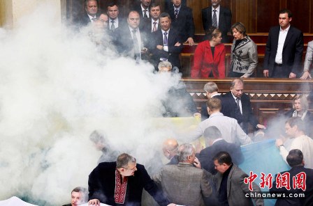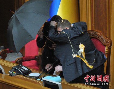 27日,烏克蘭最高拉達召開會議,討論是否通過俄黑海艦隊駐烏克蘭克里米亞半島的租期延期協(xié)議,但會議現(xiàn)場一度發(fā)生騷亂。議長利特溫被反對派議員用雞蛋打,不得不撐開黑傘躲在后面。現(xiàn)場還發(fā)生了肢體沖突,人們扭打在一起,一片混亂。更有人趁亂在議會廳內(nèi)放置至少二顆煙霧彈,導致大廳被一片濃煙籠罩,大家紛紛捂住口鼻。
