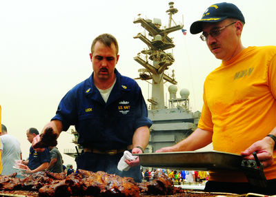 海軍官兵還特別期待一些能飽口福的“特殊的日子”,比如在生日會、少數族裔晚宴、星期天午餐會、“墨西哥煎玉米餅餐會”和“冰激凌聯誼會”上總能吃到許多可口的特色食物。此外,每天早上廚房還會烤出成箱的餅干送往各部門,這也很受士兵們喜愛。米爾斯和法度透露,航母上士兵們最喜歡的是一道名為“海浪和草地”(龍蝦和烤牛肉,作者注)的套餐,不過這種奢侈品一個月只能提供一兩次。此外,“斯坦尼斯”號的招牌菜“龍蝦天婦羅”也同樣受歡迎。