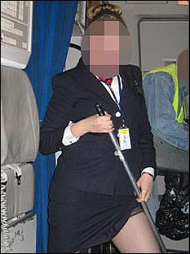 照片中的這些英航空姐穿著獨(dú)特的紅、白、藍(lán)色的制服,撩起裙子后丁字褲顯而易見(jiàn),露出臀部和性感絲襪。