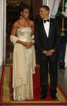 中新網(wǎng)11月25日電 據(jù)美國媒體報道,美國總統(tǒng)奧巴馬24日晚首次在白宮擺國宴款待外賓,“第一夫人”米歇爾身著華麗晚裝閃亮登場,整個國宴就像一場炫目的晚會。