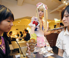 共同社在報道中提到了東京秋葉原的“云雀亭”女仆咖啡店。這些“女仆”服務員全部為身穿女裝的男性。他們頭戴假發、身著褶邊裙、帶著靚麗的妝容接待顧客。