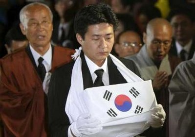 盧武鉉的國(guó)民葬遺體告別儀式29日在首爾景福宮舉行。韓國(guó)總統(tǒng)李明博、前總統(tǒng)金泳三和金大中、現(xiàn)任、前任政府高級(jí)官員,外國(guó)駐韓使節(jié)以及海外吊唁使節(jié)、遺屬以及葬禮委員會(huì)成員等三千多名人士參加了遺體告別儀式。