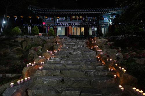 在安放故人骨灰盒的峰火山凈土苑里,從停車場(chǎng)通往法堂的山路兩旁燭光通明。在路口的空地上鋪著長(zhǎng)15米、寬1.5米的黃布。約400名吊客在空地上等待著故人。