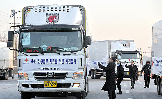 韓國支援團(tuán)當(dāng)天上午10點(diǎn)左右同朝方人員會面,利用1小時30分鐘左右的時間將50萬人份甲流感治療藥物轉(zhuǎn)載在朝方的車輛上。此前,韓國政府從朝韓合作基金中劃撥178億韓元,用于購買治療甲流的藥物。