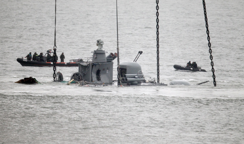 中新網(wǎng)4月13日電 據(jù)韓國《朝鮮日報(bào)》報(bào)道,4月12日下午,天安艦沉沒后的第17天,艦尾終于被吊出水面。海軍方面將艦尾移動(dòng)4.6公里,移往白翎島沿岸水深較淺的海域。