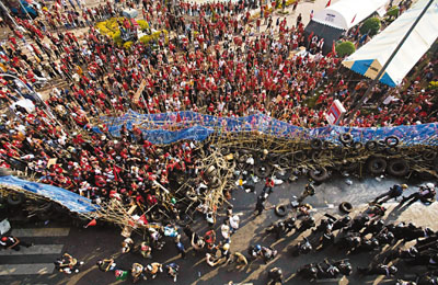 榴彈襲擊翌日,數(shù)百名防暴警察手持盾牌警棍,沒(méi)有攜帶槍械,向購(gòu)物區(qū)的紅衫軍集結(jié)點(diǎn)推進(jìn)。紅衫軍用尖竹和車胎堆成3米高的路障,并灑上汽油,迫使警方退后。紅衫軍后來(lái)答應(yīng)警方要求,后退100米,但并未拆除路障。
