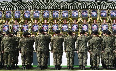 中新網(wǎng)4月26日電 據(jù)韓國《朝鮮日報》報道,韓國政府決定對天安艦46名遇難官兵各晉一級,并追授花郎武功勛章。遇難官兵聯(lián)合葬禮將于25日至29日以海軍葬方式舉行,29日指定為國家哀悼日。