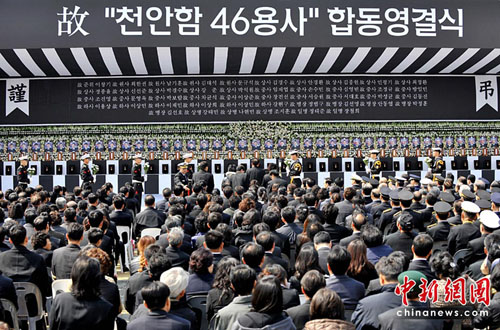 中新網4月29日電 據韓聯社報道,在爆炸沉沒事件中遇難的韓國警戒艦天安艦46名官兵的遺體告別儀式29日上午在韓國海軍平澤第二艦隊司令部內安保公園舉行。