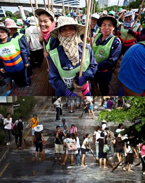 在網上發起年輕人前來清洗的一名前航空公司官員說,“在危機面前,我沒法坐視不管。我上網發信息,邀約大家來清掃街道”。“我決定每周末都出去清理曼谷市容,直到曼谷恢復原樣”。