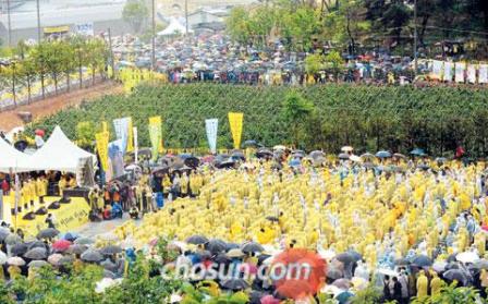 據(jù)報(bào)道,當(dāng)天,在舉行盧武鉉逝世一周年追悼?jī)x式的峰下村,大雨如注,然而前來(lái)追悼的客人仍然絡(luò)繹不絕。