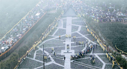 當(dāng)天下午1點(diǎn)30分在墓前面的空地,追悼?jī)x式開(kāi)始了。現(xiàn)場(chǎng)上映了追悼前總統(tǒng)盧武鉉的短片,追悼?jī)x式現(xiàn)場(chǎng)人潮一度達(dá)到3萬(wàn)多名。