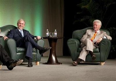 克林頓卸任后,多次與布什的父親、即前總統(tǒng)老布什合作,例如替南亞海嘯及超級(jí)颶風(fēng)“卡特里娜”天災(zāi)的災(zāi)民籌款,兩人有一段時(shí)間經(jīng)常走在一起。布什開玩笑道,不知道自己的父親花了多少時(shí)間與克林頓同場(chǎng)亮相。