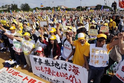 中新網(wǎng)4月26日電 據(jù)日本“共同社”網(wǎng)站報(bào)道,反對美軍普天間機(jī)場縣內(nèi)搬遷、向日美雙方政府要求將機(jī)場遷至沖繩縣外或國外的沖繩縣民集會25日下午在該縣讀谷村舉行。主辦者稱約有9萬人參加了集會。這是各黨派首次就普天間問題舉辦集會活動。沖繩縣知事仲井真弘多在發(fā)言中表示“希望政府能出示負(fù)責(zé)任的解決方案,遵守眾院選舉時的承諾”,要求改善基地負(fù)擔(dān)集中于沖繩的現(xiàn)狀。
