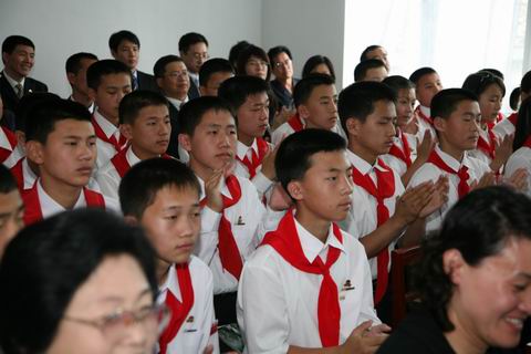參觀結束后,劉大使一行與“毛澤東班”全體師生在學校禮堂舉行了紀念聯歡活動。東平壤一中校長康相福在講話中首先歡迎劉大使及北京五中代表團在“毛澤東班”命名50周年之際來到學校。他說,金日成主席和毛澤東主席為我們締造了朝中友好關系,兩國人民對他們懷有無限的敬仰之情。50年前的今天,在朝中兩國人民之間的戰斗友誼不斷加深之際,“毛澤東班”得以命名。自那時起,東平壤一中“毛澤東班”和北京五中“金日成班”開展了活躍的友好交流,為加深兩國青少年及兩國人民間的友好感情作出了貢獻。每逢重要節日,“毛澤東班”和“金日成班”的師生們總會互致問候。去年,東平壤一中代表團訪華,參加了北京五中建校80周年慶祝活動。明年將是“金日成班”命名60周年。相信兩校兩班將為朝中友誼的不斷發展做出積極貢獻。
