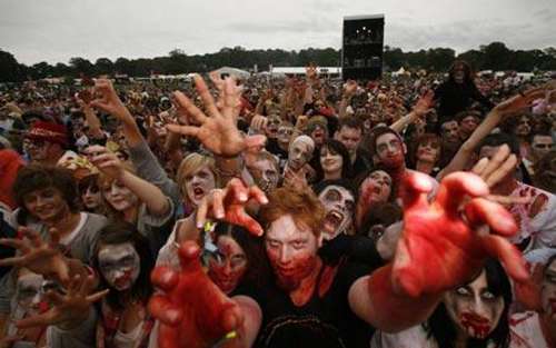 這幕駭人畫面出現在該市舉行的大寒音樂節(Big Chill festival)上,共有4026人把自己打扮成形狀可怖的僵尸。他們還參與了一部僵尸片的拍攝。不過,主辦單位相信實際數目遠不止此,因為還有很多人沒有填寫表格。