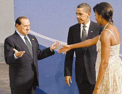 據香港《文匯報》報道,晚宴上,奧巴馬夫婦以東道主身份負責迎賓,被意大利媒體稱為“性上癮”的老貝見到美國第一夫人米歇爾時顯得相當高興,伸出雙臂示意互相擁抱。誰知米歇爾遠遠伸出一只手,示意握手打招呼,令場面顯得很尷尬。更值得注意的是,站在一旁的奧巴馬一臉冷漠,斜睨老貝,顯得十分警惕。
