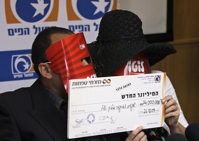 中新網(wǎng)4月15日電 據(jù)美國媒體報道,以色列一對夫婦13日現(xiàn)身領取了以色列最大數(shù)額彩票頭獎,共2000萬美元獎金。他們頭戴面具掩藏自己的身份,并稱一直都不知道這張已經(jīng)握了4個月的彩票中了大獎。