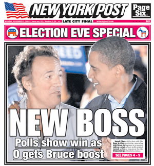 據美國《紐約郵報》3日報道,美國當地時間11月2日,奧巴馬一家在俄亥俄州克利夫蘭的競選集會上與著名美國搖滾歌手布魯斯斯普林斯廷同臺獻藝。新一輪民調顯示,離大選還有最后一天,奧巴馬已經贏了。該報封面用“新老板”來稱呼勝利在望的奧巴馬。該報稱:斯普林斯廷用歌聲表達了對奧巴馬的贊揚。據悉,1984年大選中,獲勝的里根曾引用斯普林斯廷的歌詞以爭取年輕人的選票。